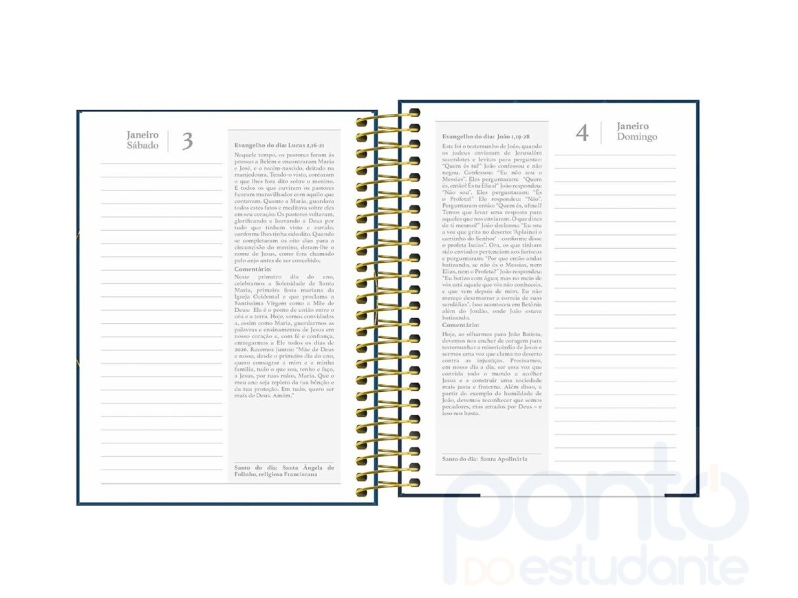 A Agenda Espiral Diária 12,9 x 18,7 cm Bíblica 2026 tem visão de 1 dia por página. O produto tem capa dura, acabamento espiral e 208 folhas.