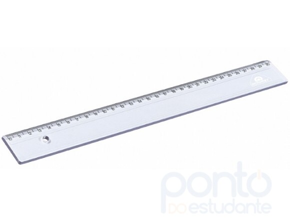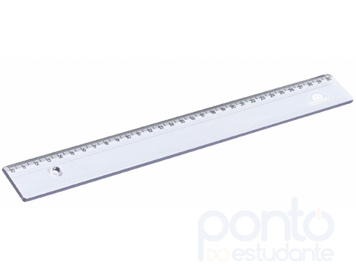 Régua em poliestireno, com escala de 30 cm gravada por transferência de imagem, garantindo alta precisão.