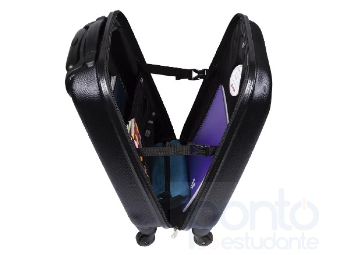 Além disso, tem limitador de abertura, que possibilita o uso da mala na posição