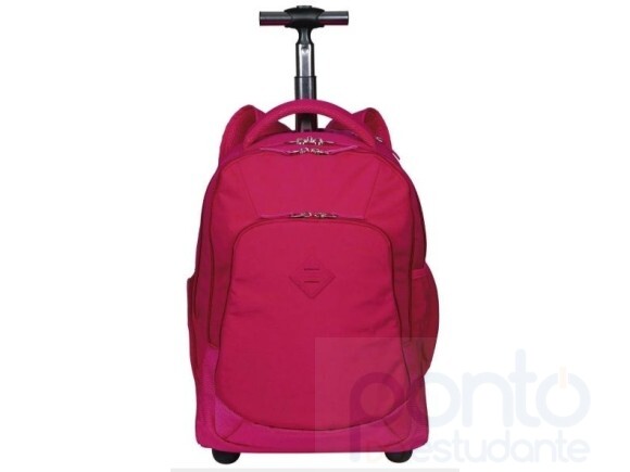 É mochila e carrinho 2 em 1, possui alças de costas anatômicas, que proporcionam maior conforto aos ombros, e um compartimento atrás para guardar elas, alça de mão espumada, carrinho externo com haste de alumínio em dois níveis e duas rodas, facilitando o transporte.