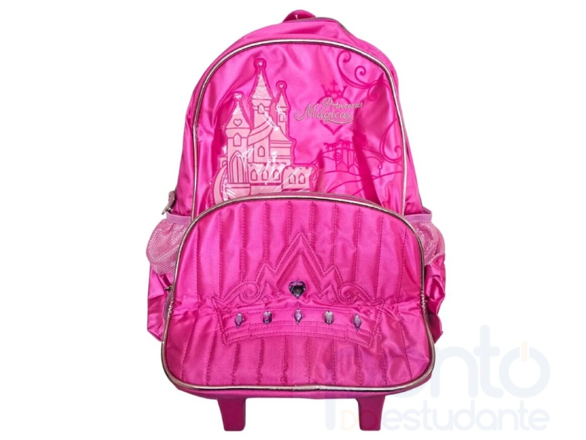 Design encantador para meninas, com tema de princesa Rodinhas e alça retrátil para facilitar o transporte Resistente ao uso diário, ideal para o ambiente escolar Leve e espaçosa, comporta livros, cadernos e outros itens escolares Fácil de manusear, perfeito para crianças