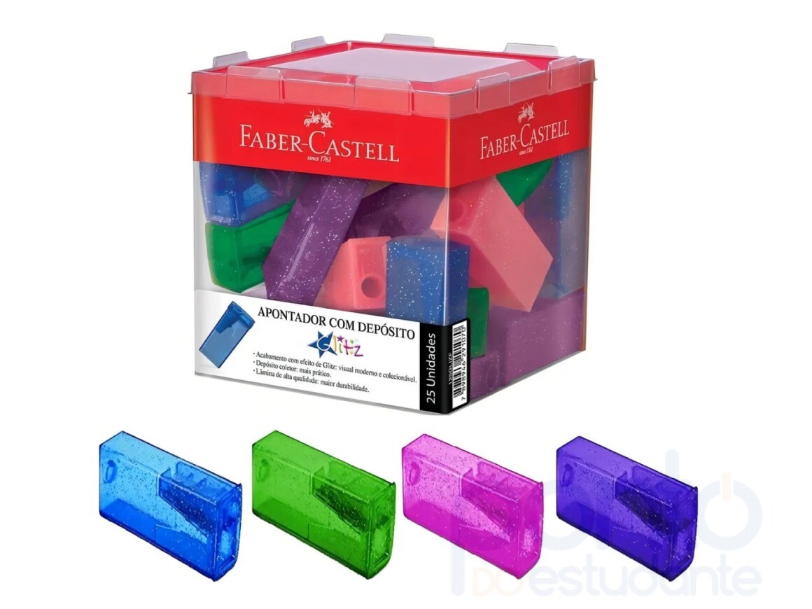 O apontador com depósito da Faber-Castell apresenta cores vibrantes com acabamento em glitter e um depósito espaçoso para maior comodidade. A lâmina de aço temperado assegura mais facilidade ao apontar e prolonga a vida útil do produto.