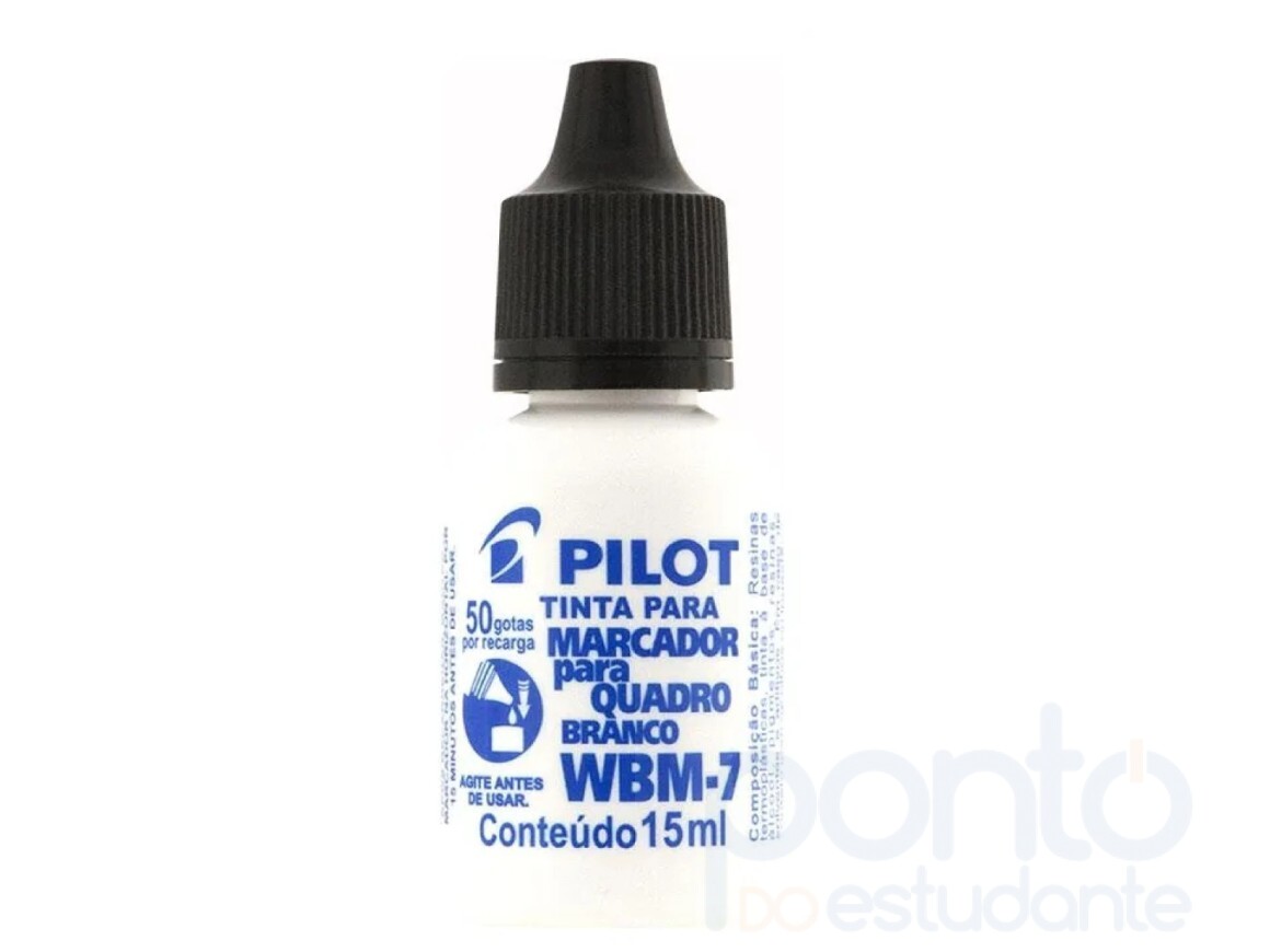 A Tinta para Marcador de Quadro Branco WBM-7 é uma fórmula desenvolvida sob medida para o Marcador de Quadro Branco WBM-7 da PILOT. Com propriedades cuidadosamente selecionadas, essa tinta é projetada para manter e prolongar as qualidades excepcionais do seu marcador, durabilidade e garantindo uma escrita suave e marcante . Poucas gotas são necessárias para a recarga, de forma que 50 gotinhas realizam uma recarga completa do WMB-7.
