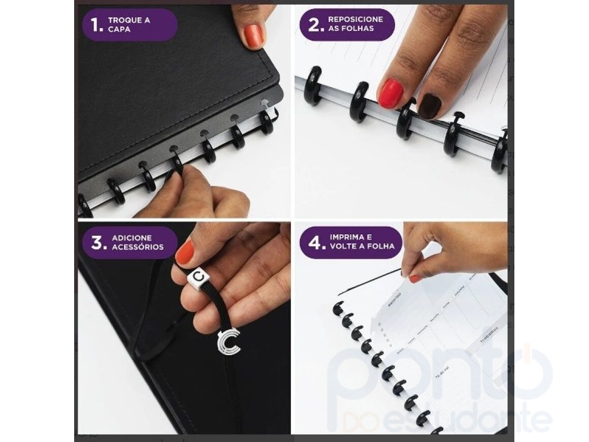 01 folha de identificação com calendário no verso, 04 divisórias com abas para identificação (02 pretas e 02 transparentes), 140 folhas 90g (120 folhas pautadas linhas brancas e 20 folhas lisas brancas para impressão)