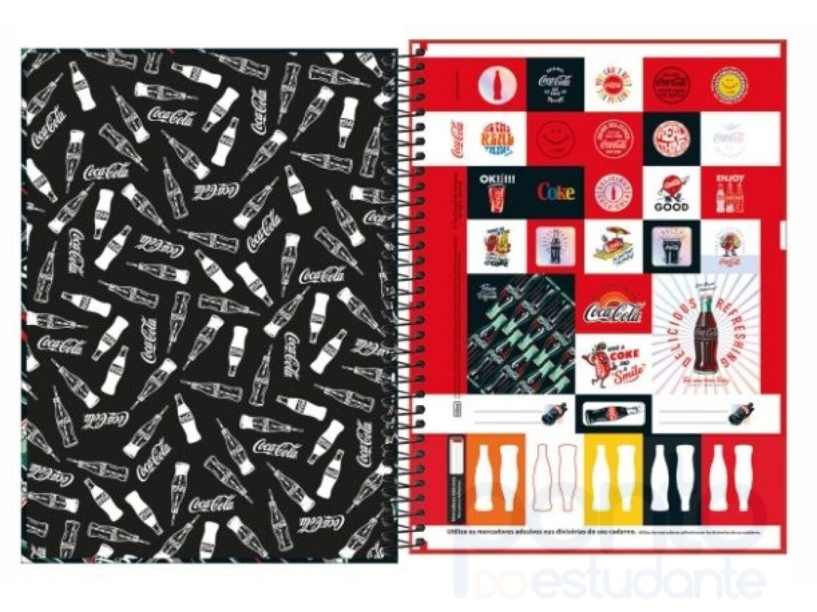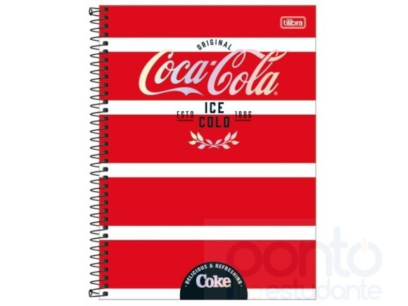 O Caderno Espiral Capa Dura Universitário 1 Matéria Coca-Cola 80 Folhas possui capa dura com acabamento metalizado, parte interna decorada, bolsa plástica para guardar trabalhos e anotações, folha com adesivos funcionais e folhas com Miolo Tilibra Connect.