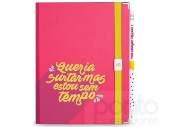Capa Dura, com cantos arredondados, porta-lápis/caneta, e fechamento com elástico (com clip plástico).