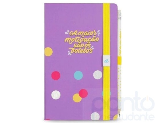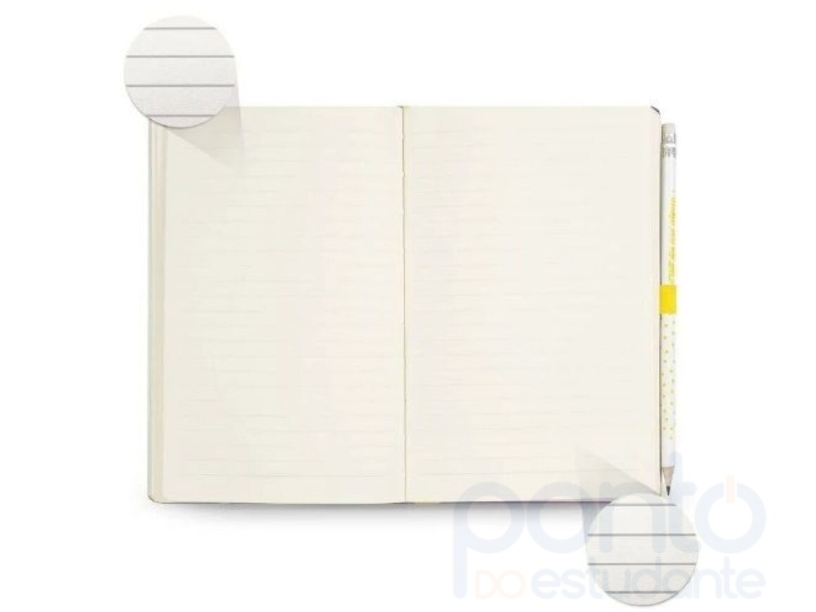 Capa Dura, porta-lápis/caneta e fechamento com elástico (com clip plástico).