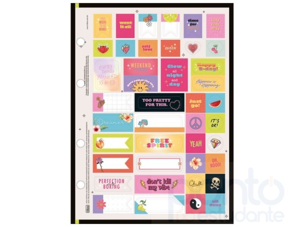 O Refil Tiliflex para Caderno Argolado Colegial Capricho 80 Folhas possui cartela de adesivos e folhas pautadas decoradas.