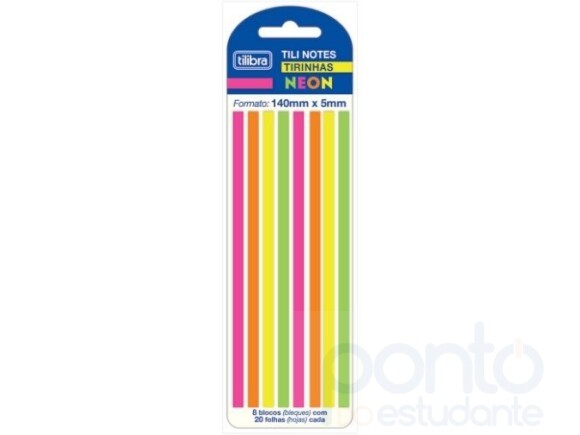 O Tili Notes Neon 140x5mm é um conjunto de fitas autoadesivas reposicionáveis para destacar e marcar páginas.