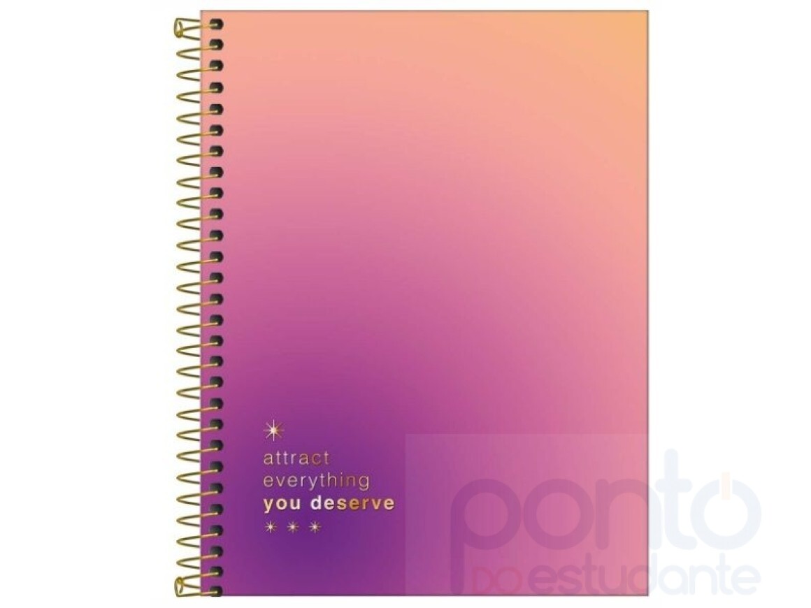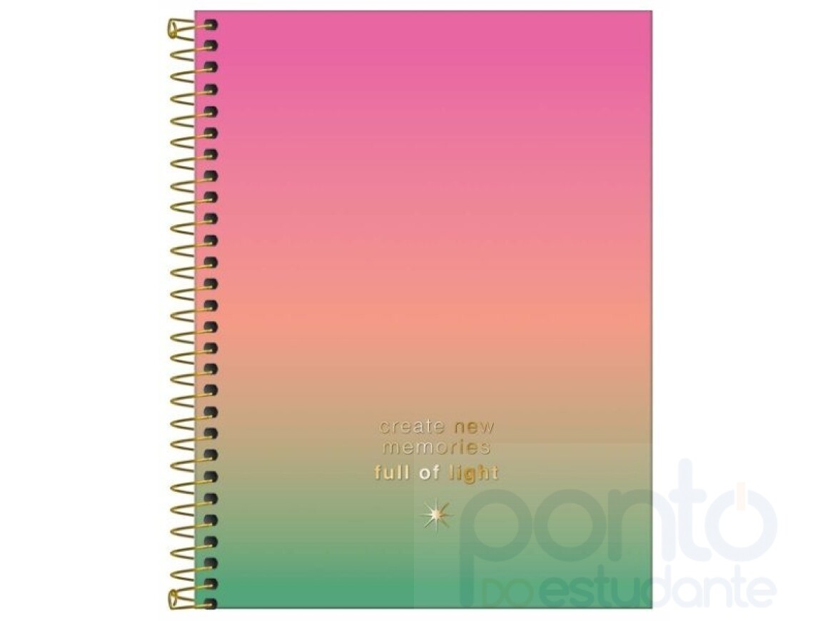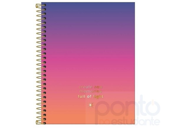 Use este modelo, com capa dura e parte interna decorada, espiral colorido, bolsa de papel decorada para guardar trabalhos, adesivos funcionais, folhas pautadas, decoradas e destacáveis, para anotar as aulas, fazer resumos, listar tarefas e organizar as ideias de forma prática e eficiente.