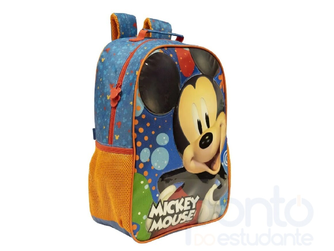 Mochila 16 Mickey R - 10512 - Em tamanho 16", é produzida em poliéster resistente e estampado. Painel frontal PVC patch com espuma - Compartimento principal amplo, 2 bolsos laterais em mesh com elástico. Zíper com puxadores personalizados. Alças acolchoadas com regulagem de tamanho para maior conforto.