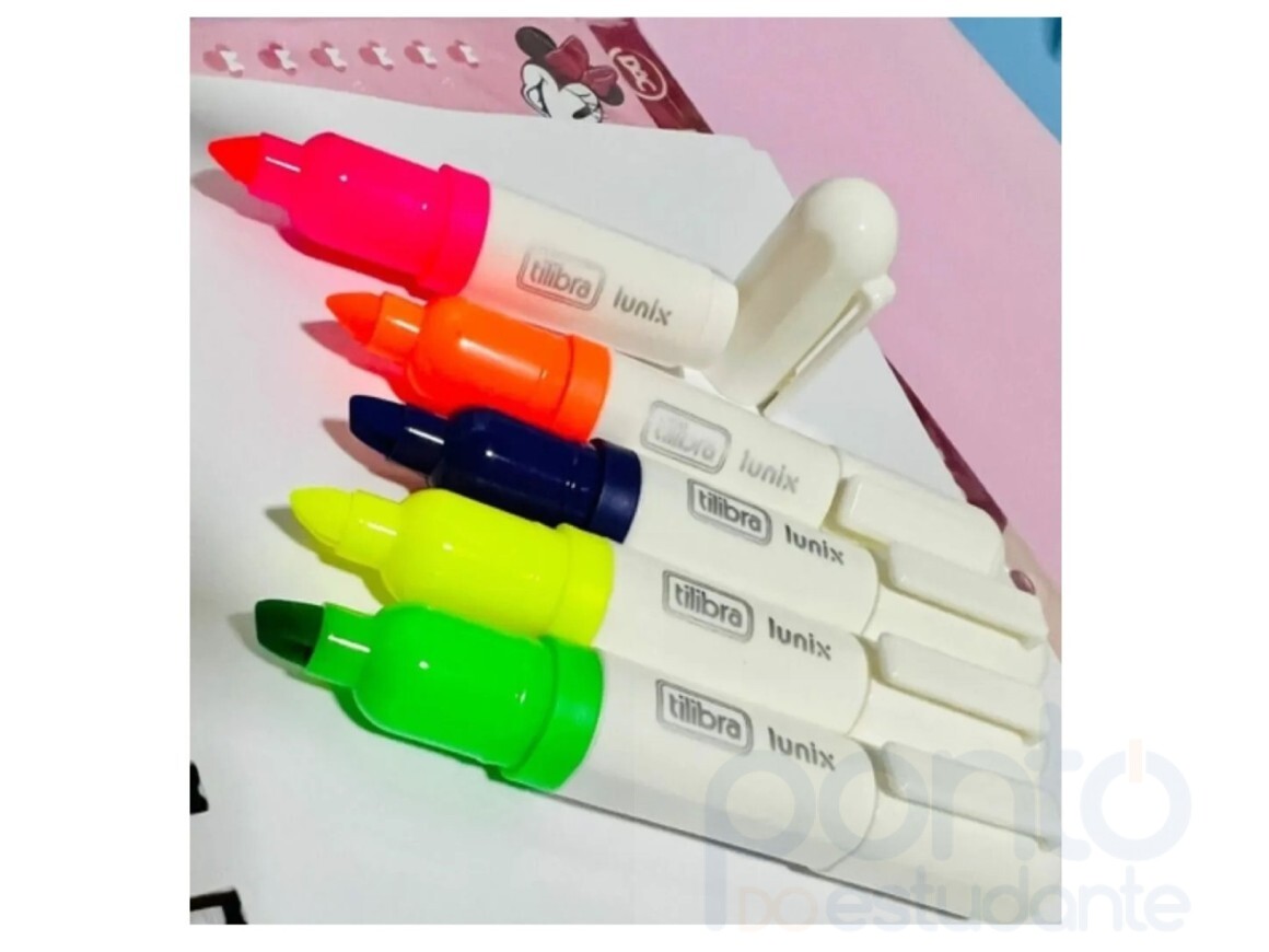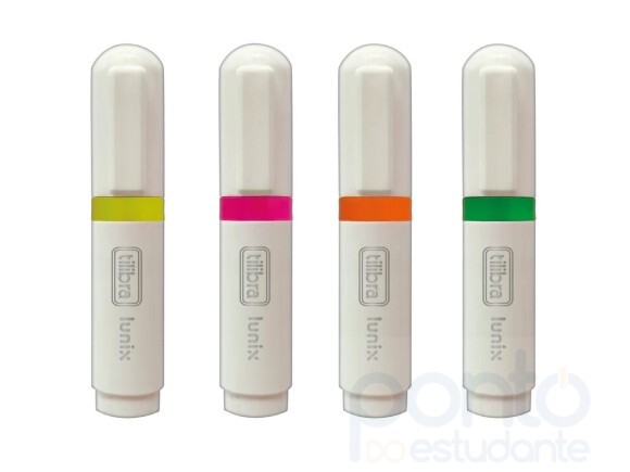 O Marca-Texto Mini Lunix possui ponta chanfrada que pode variar de 1 a 4,5 mm, de acordo com a inclinação. O produto está disponível em display com 4 cores, laranja, rosa, verde e amarelo.